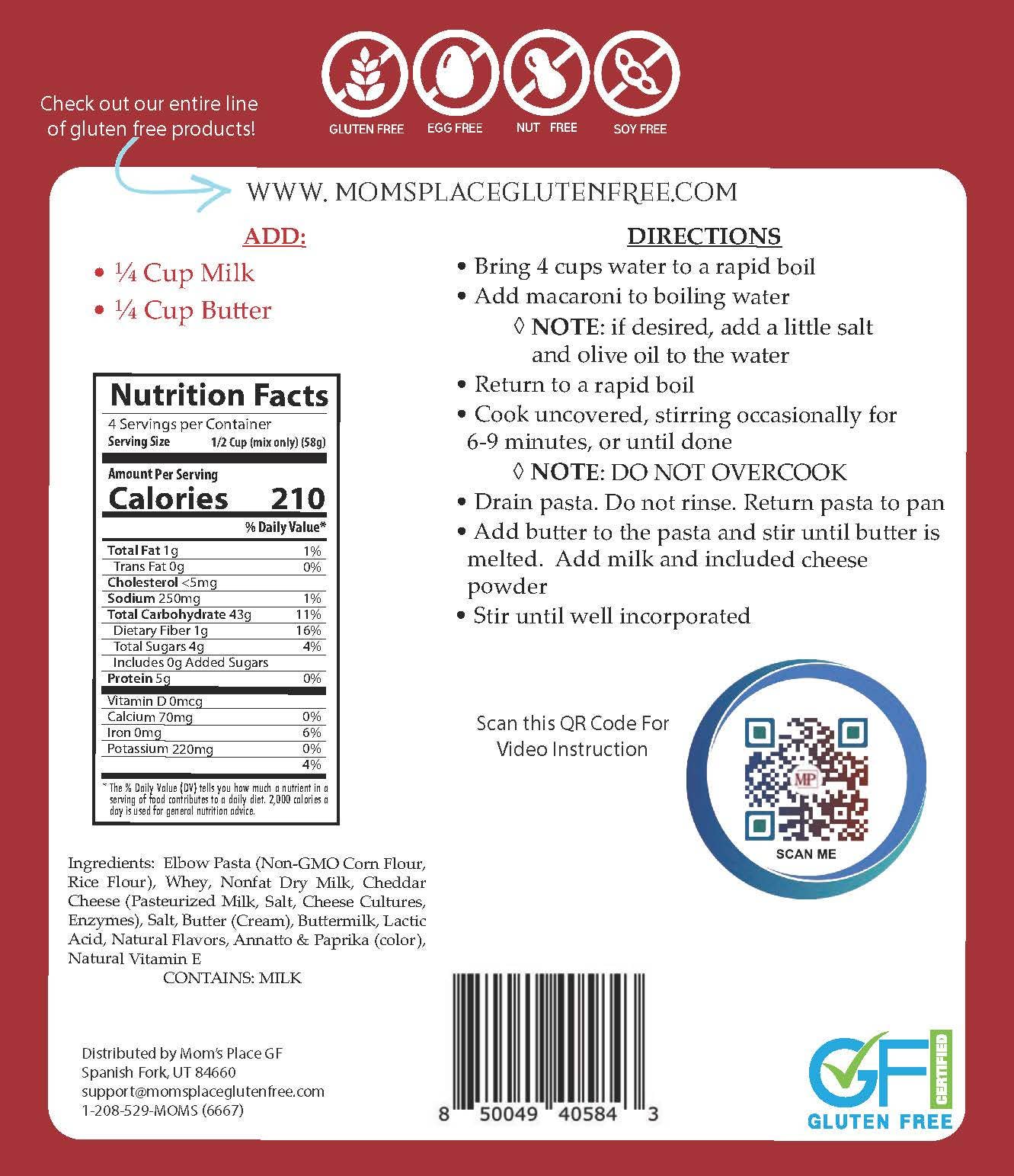 * SAFETY & QUALITY: Mom’s Place Gluten-Free owns and operates its own manufacturing facility located in Spanish Fork, Utah. We are a dedicated nut-free and gluten-free facility committed to providing the highest quality and best tasting food available.